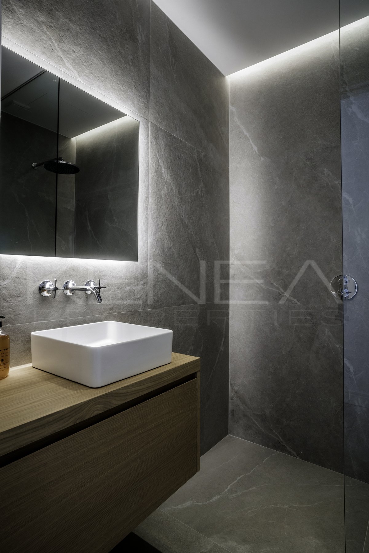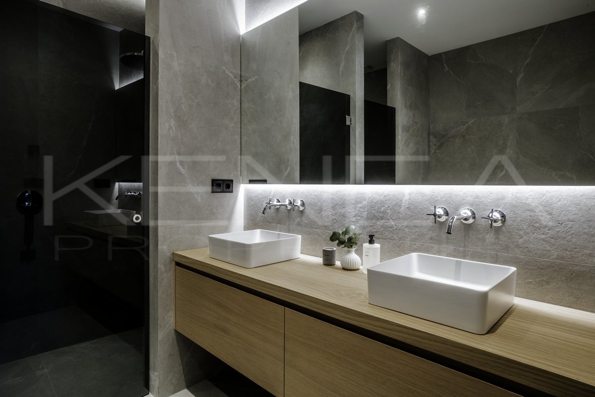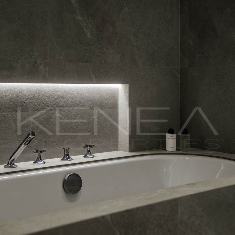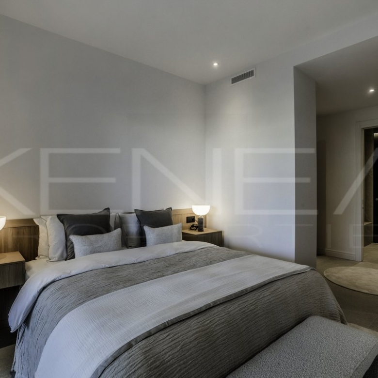 Los tres dormitorios son refinados y sofisticados, con detalles en madera, armarios a medida y una favorecedora iluminación LED en todas las estancias. Los baños, elegantemente decorados, cuentan con lujosas duchas y grifería de Dornbracht, y el amplio baño principal dispone de bañera y lavabo doble.