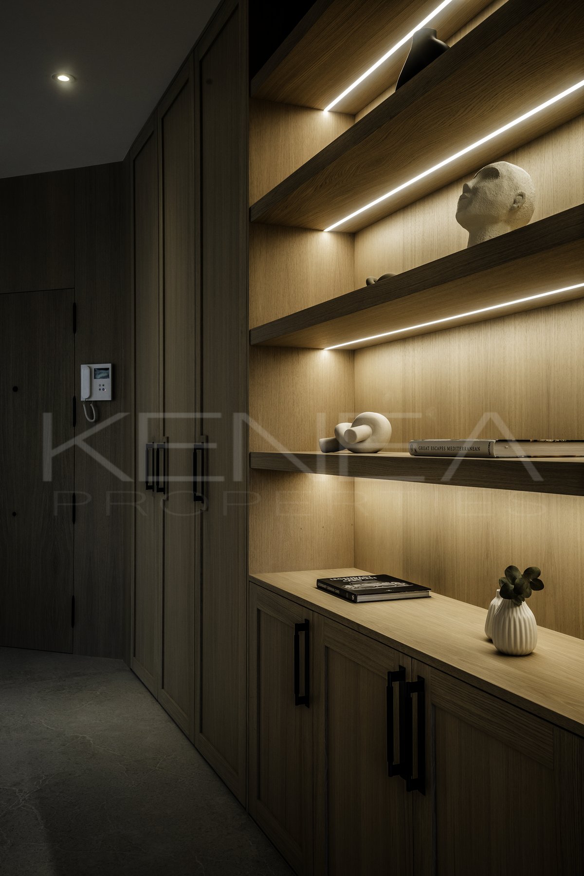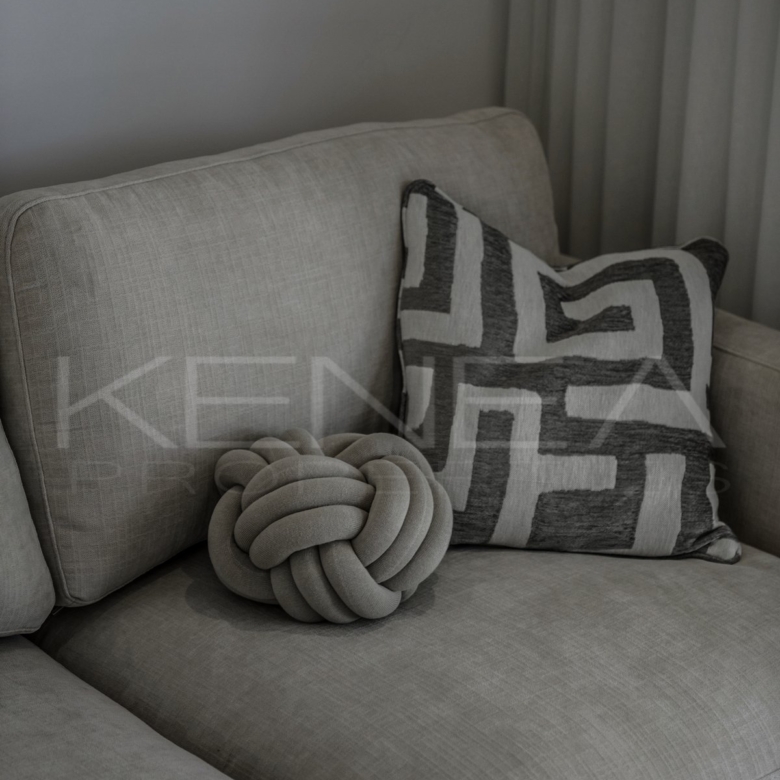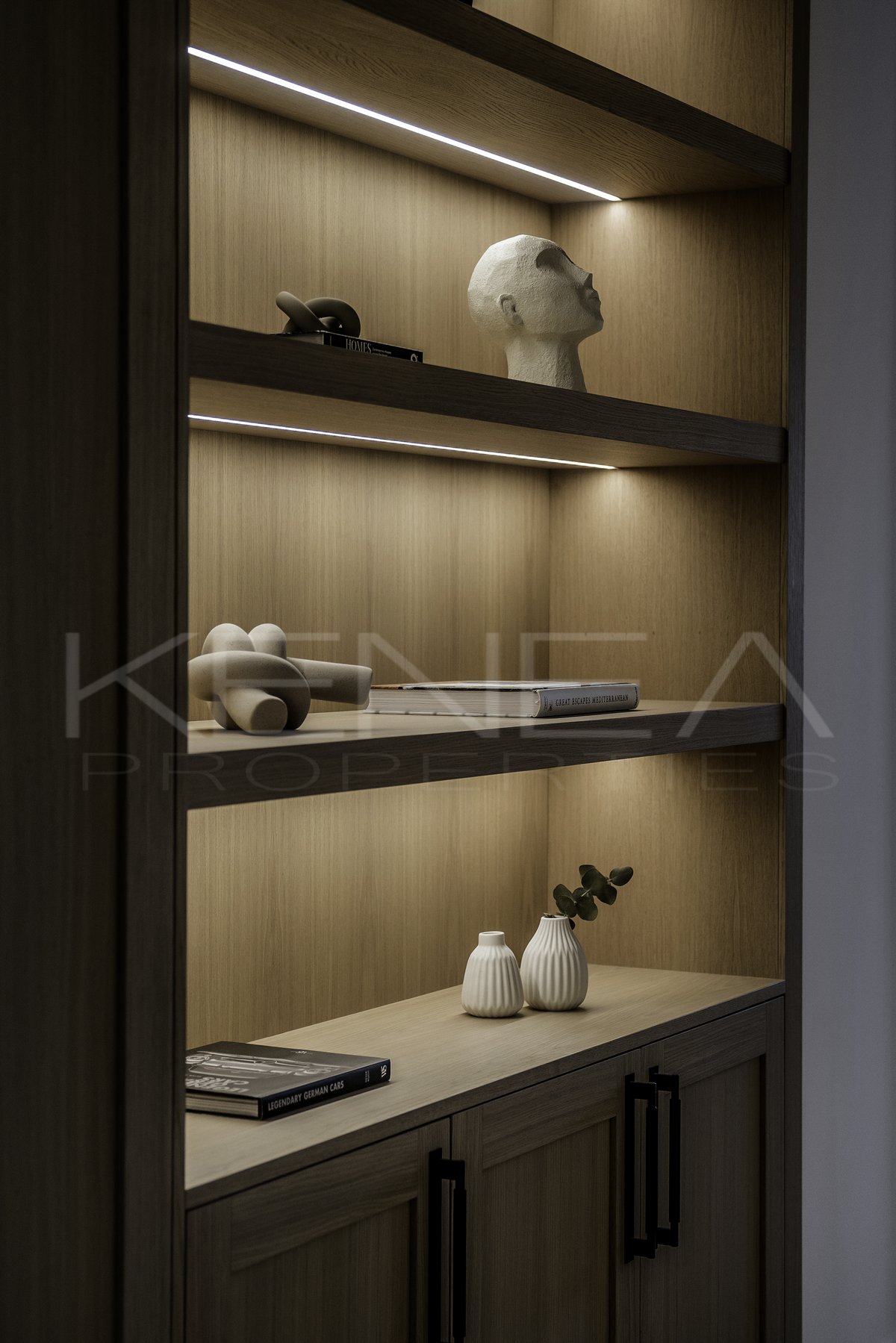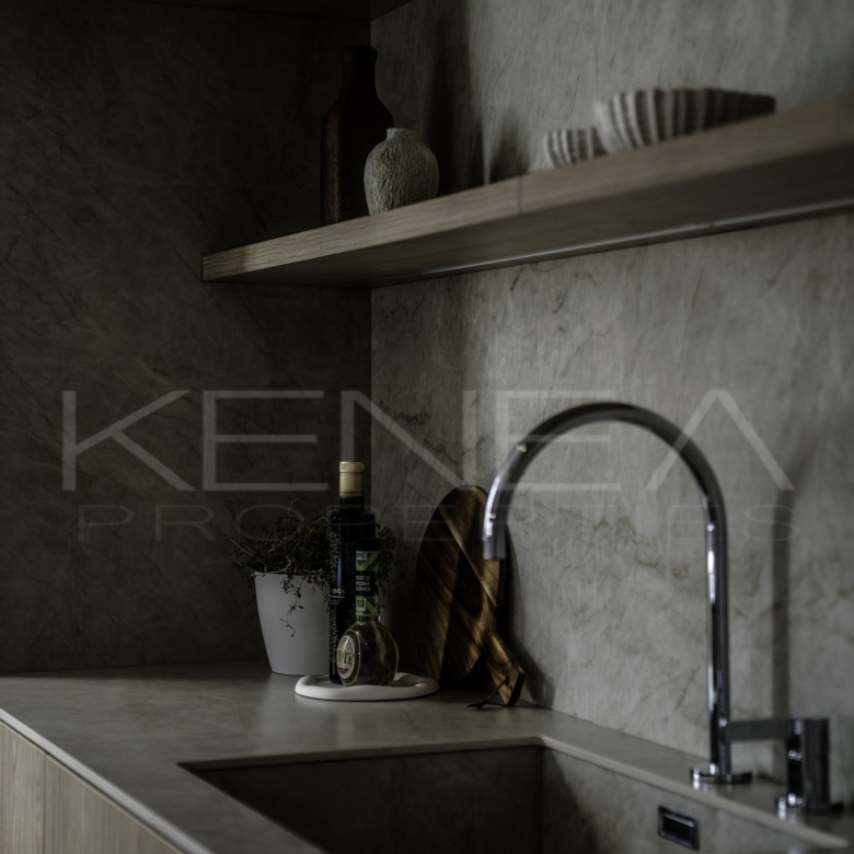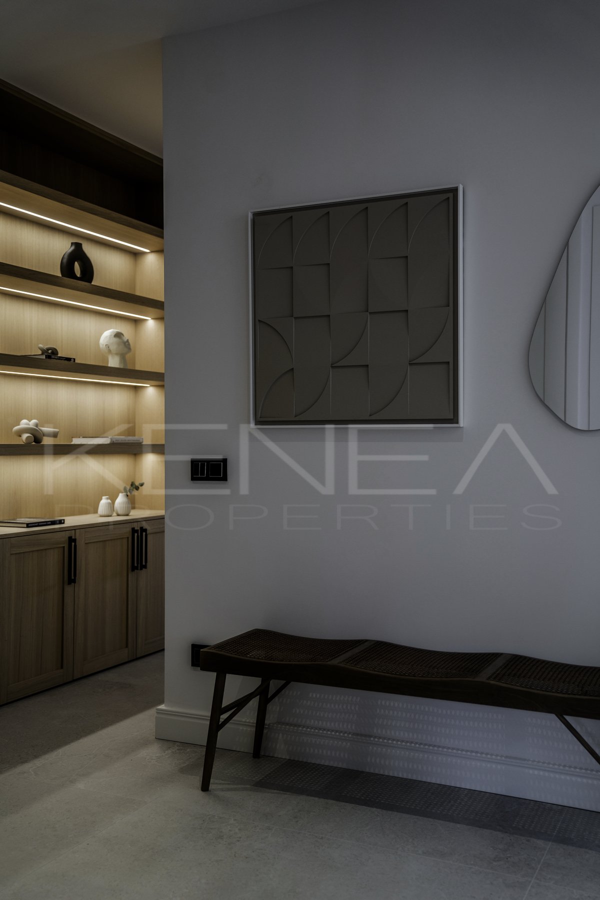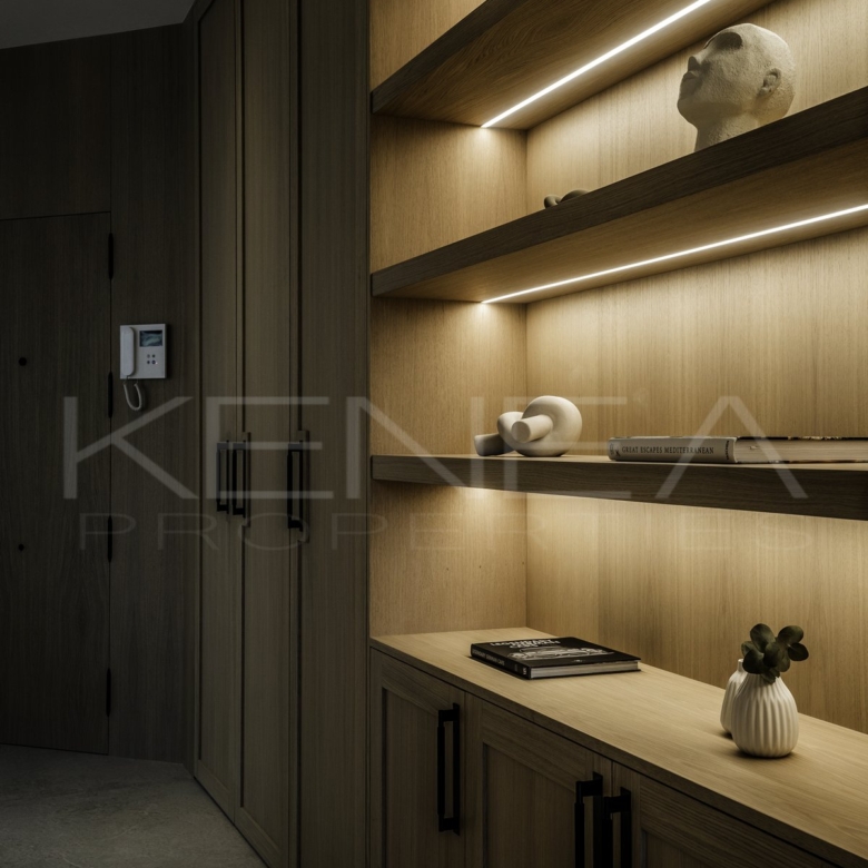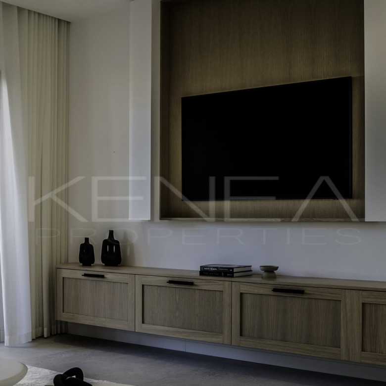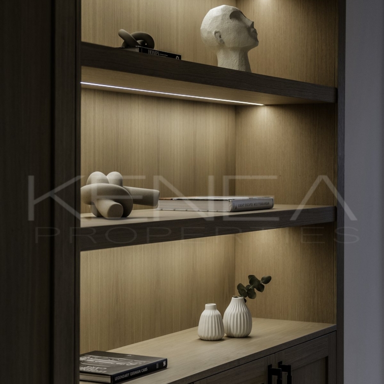 Al entrar en la sala de estar, le da la bienvenida una cocina a medida elegante y funcional. Cuenta con impresionantes detalles de madera oscura en la isla y los armarios, complementados con una relajante encimera de mármol «Taj Mahal». Con amplio espacio de almacenamiento, generosas encimeras y una vinoteca, es una cocina moderna e increíblemente funcional para quienes disfrutan cocinando y recibiendo visitas. El salón es cálido y acogedor, con una majestuosa pared de televisión y un amplio banco que ofrece gran capacidad de almacenamiento.