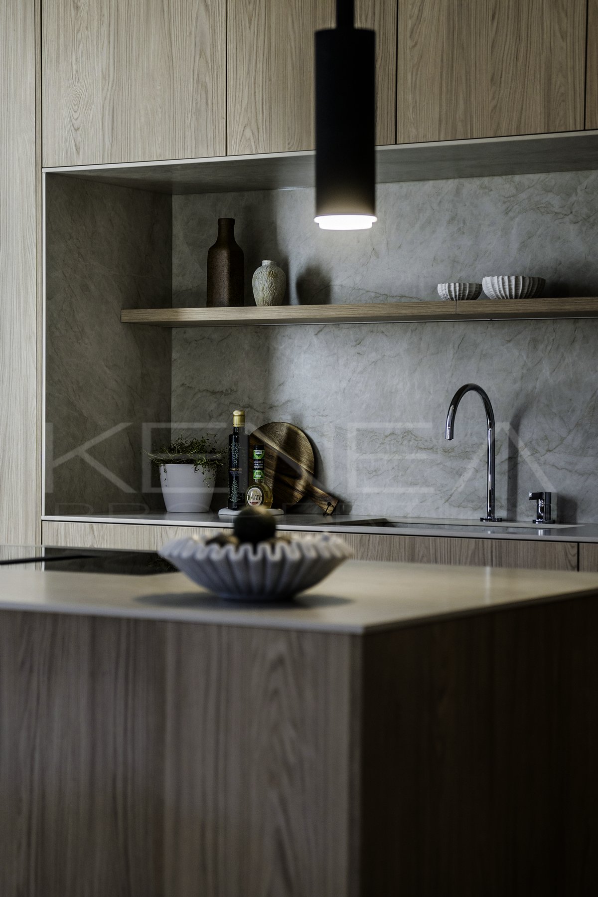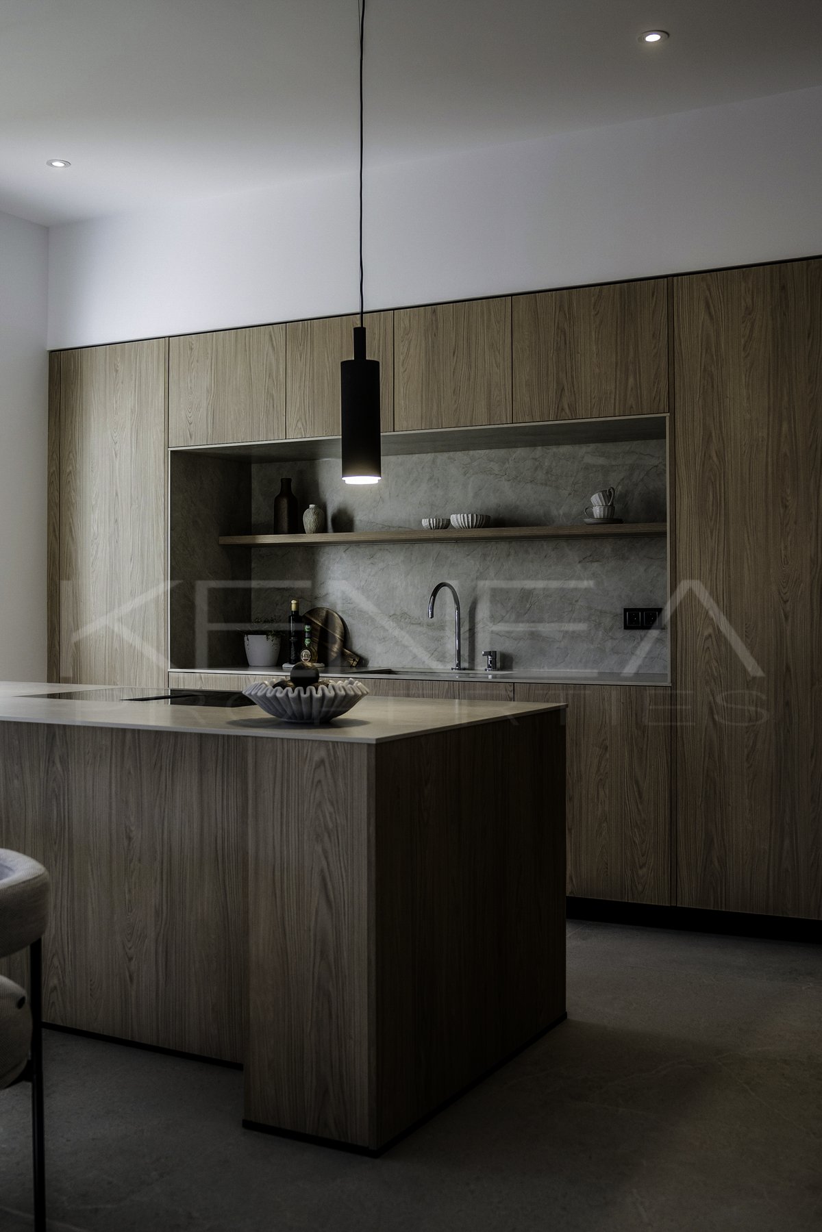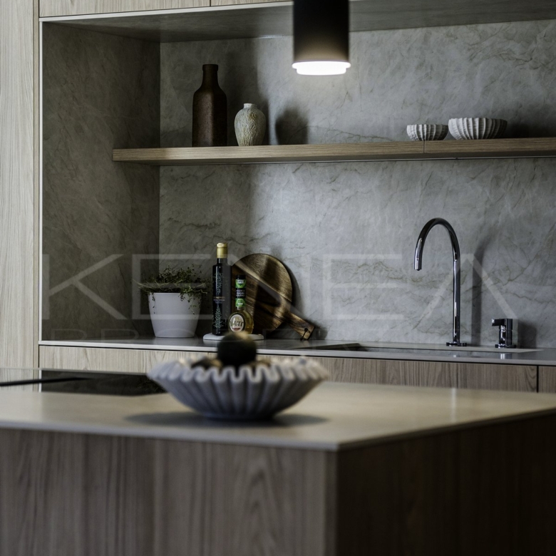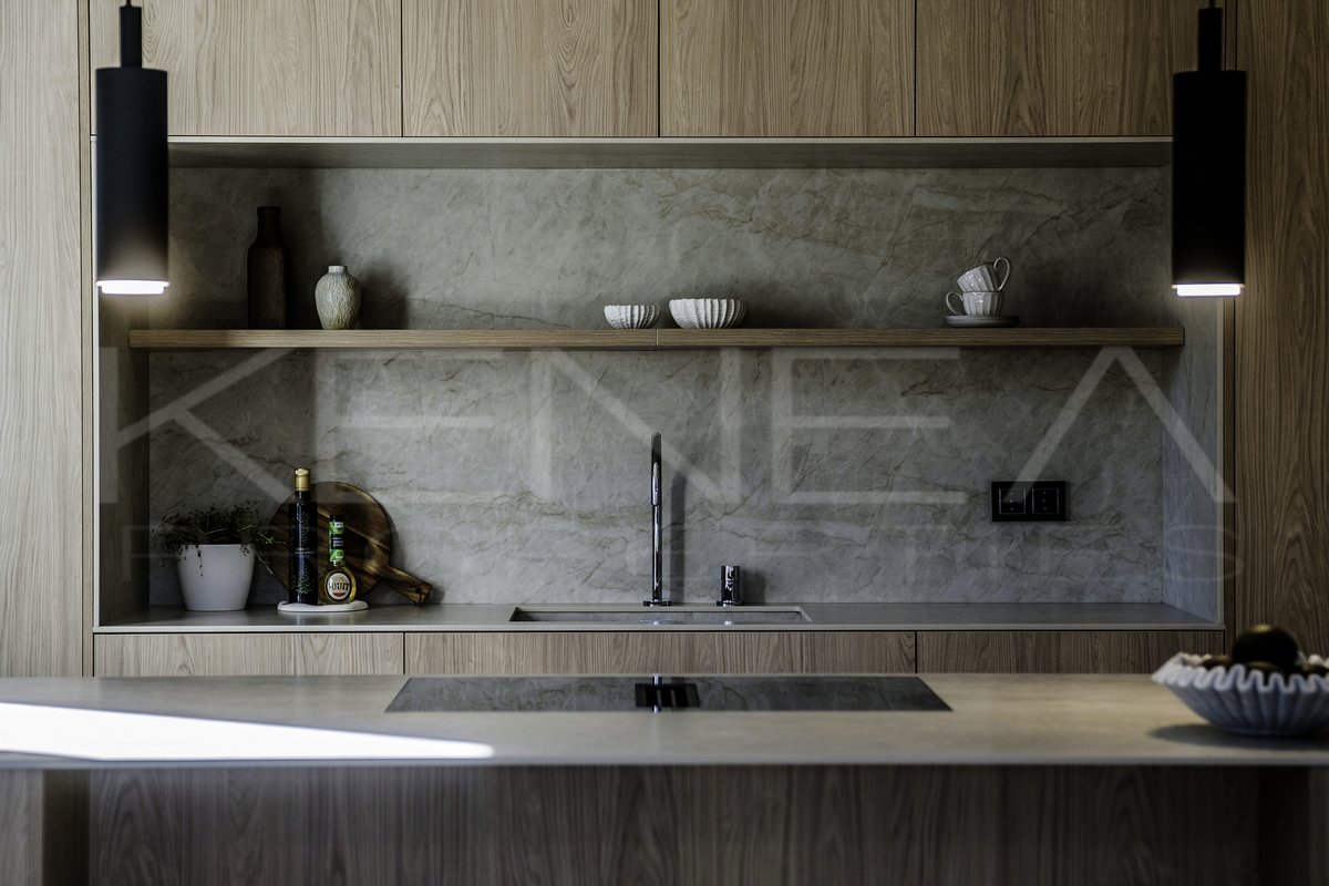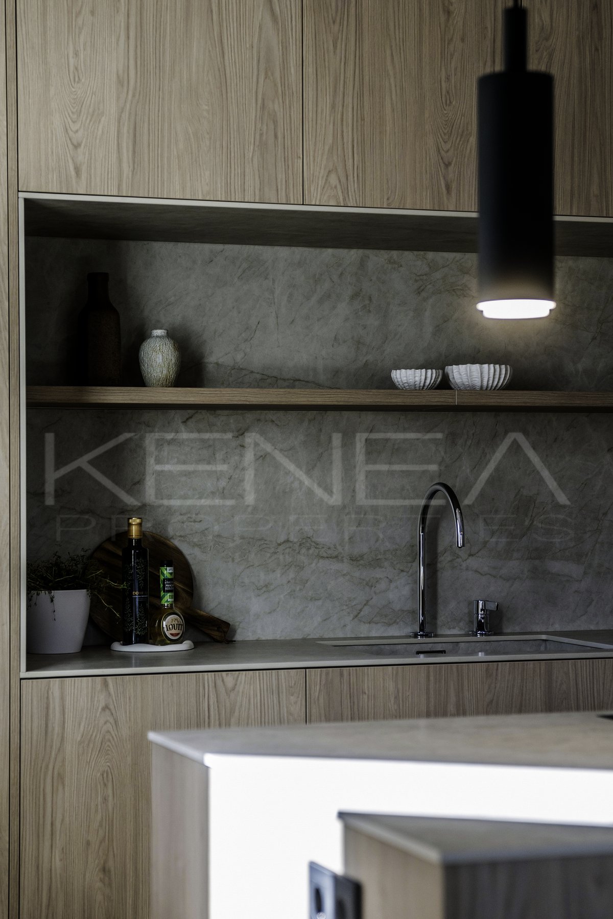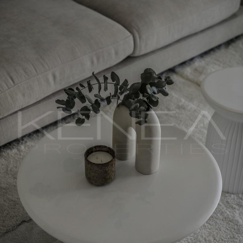 Al entrar en la sala de estar, le da la bienvenida una cocina a medida elegante y funcional. Cuenta con impresionantes detalles de madera oscura en la isla y los armarios, complementados con una relajante encimera de mármol «Taj Mahal». Con amplio espacio de almacenamiento, generosas encimeras y una vinoteca, es una cocina moderna e increíblemente funcional para quienes disfrutan cocinando y recibiendo visitas. El salón es cálido y acogedor, con una majestuosa pared de televisión y un amplio banco que ofrece gran capacidad de almacenamiento.