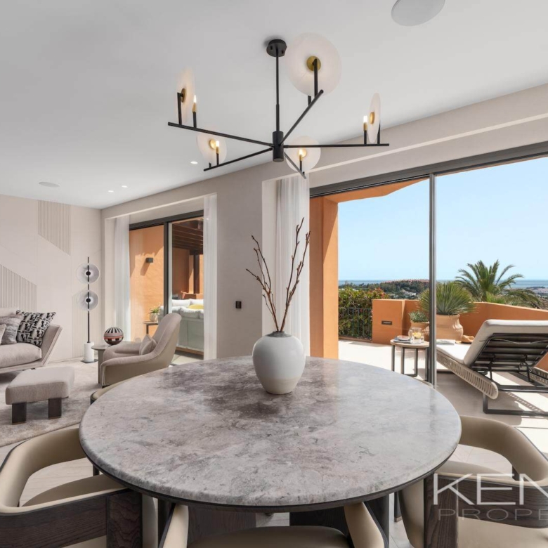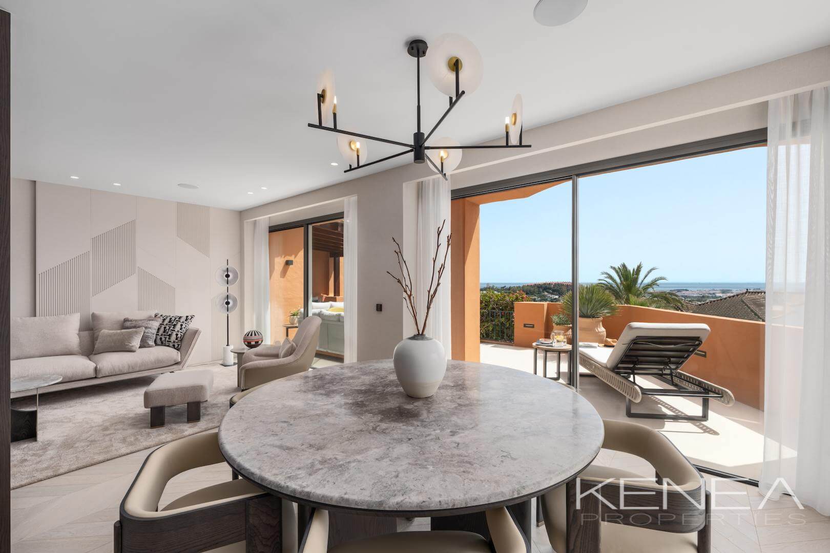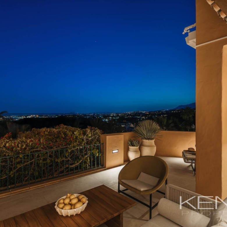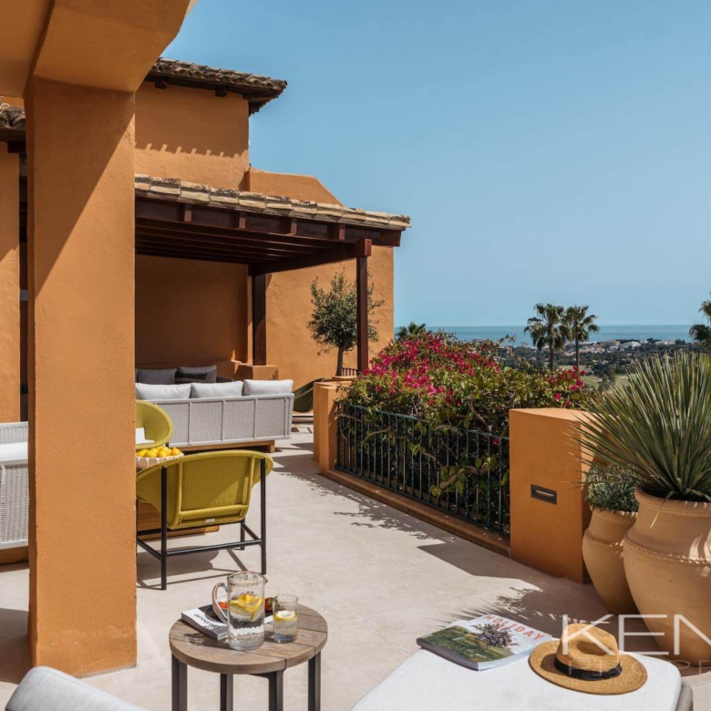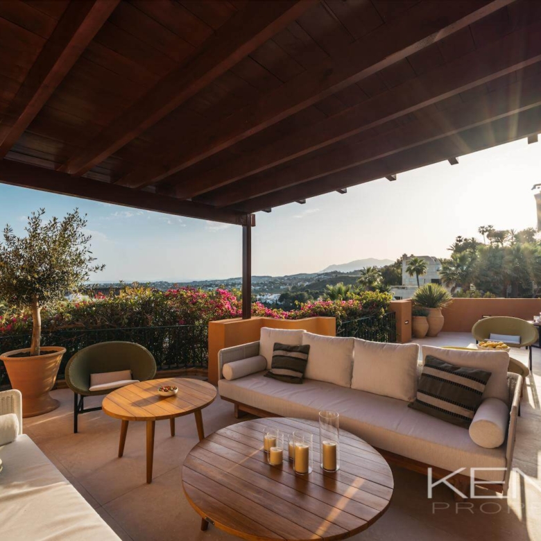 Bienvenido a Les Belvederes A5, un apartamento en planta baja elevada con muchísimo estilo, situado en la exclusiva zona de La Cerquilla, Nueva Andalucía. Desde aquí tienes unas vistas de postal al Mediterráneo, las montañas y los campos de golf que lo rodean.