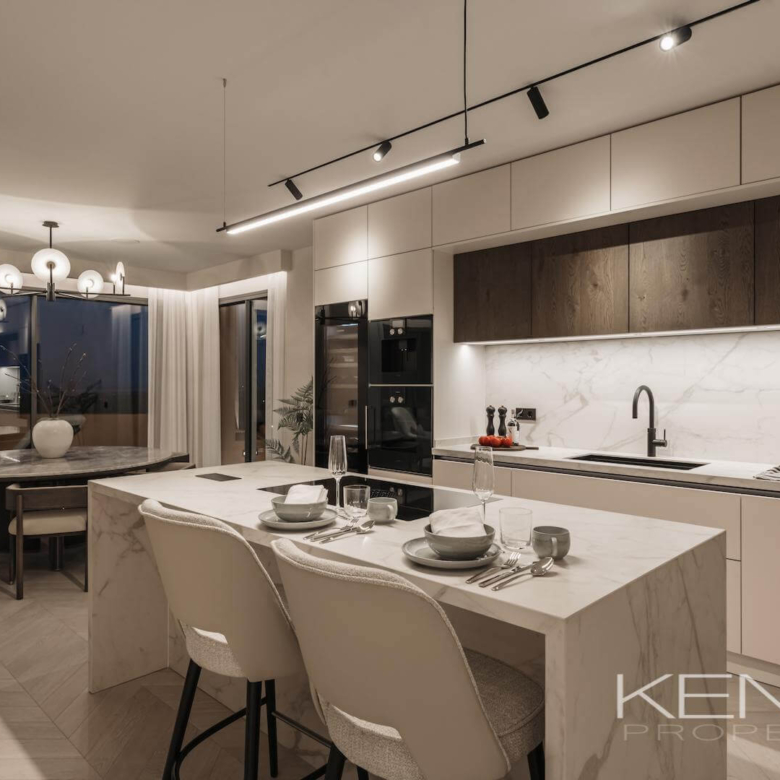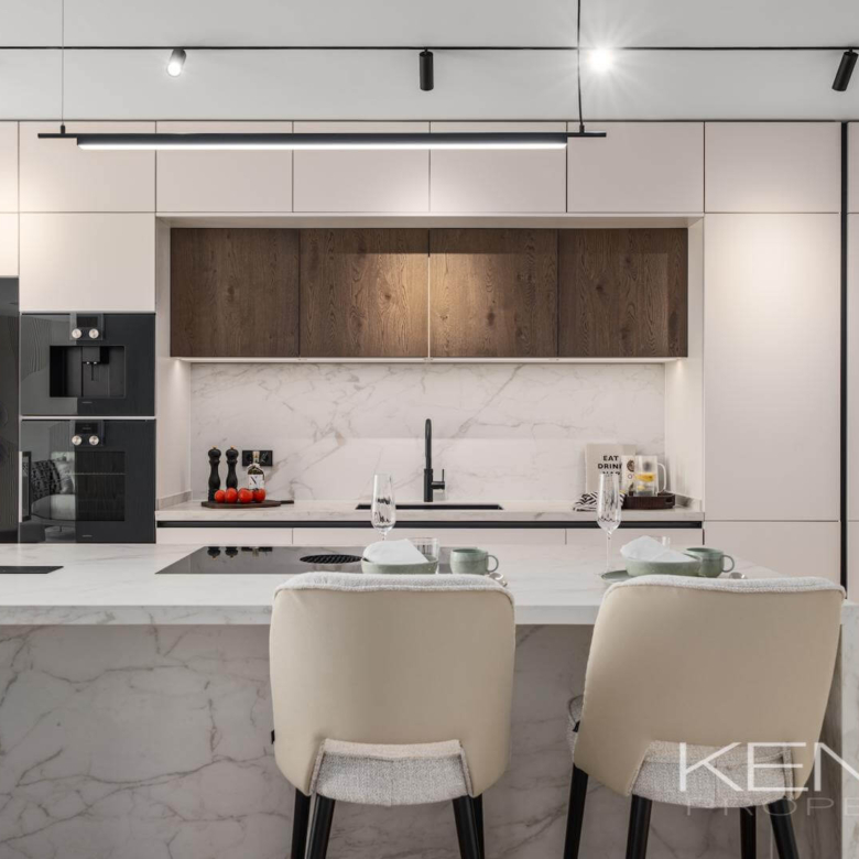 El corazón de la casa es su salón-comedor de concepto abierto, con ventanales enormes que dejan entrar toda la luz y se conectan directamente con la gran terraza. La cocina es de esas que te hacen querer cocinar todos los días: equipada con electrodomésticos Gaggenau de última generación, suelos de roble natural que aportan calidez, y un sistema de domótica para controlar la casa desde un solo toque.