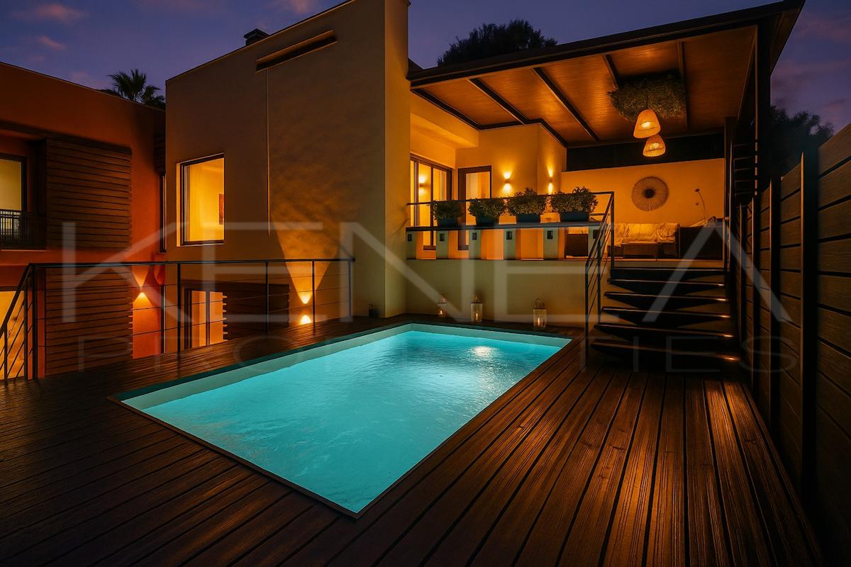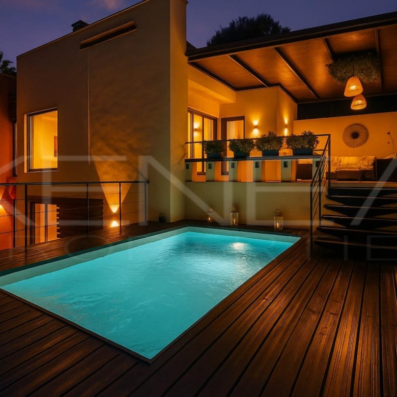 Con 285 m² construidos en 2 plantas sobre parcela de 400 m², esta joya ofrece amplitud y comodidad suprema. El salón principal se funde con una terraza soleada que da acceso directo a la piscina privada, el rincón perfecto para relajarte o celebrar momentos inolvidables en total intimidad.