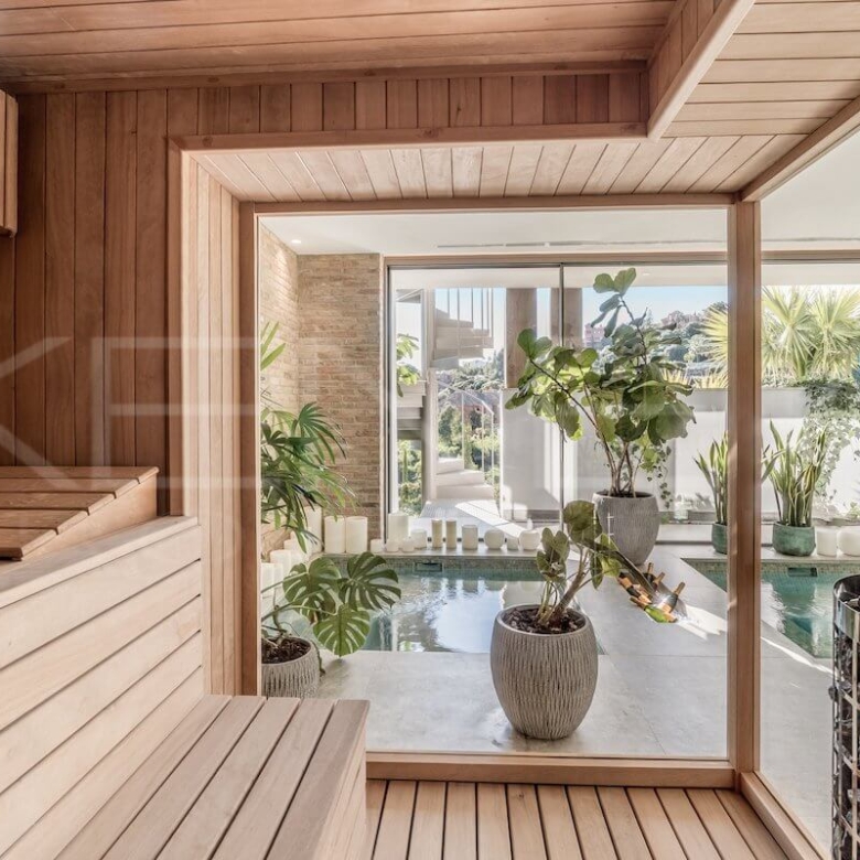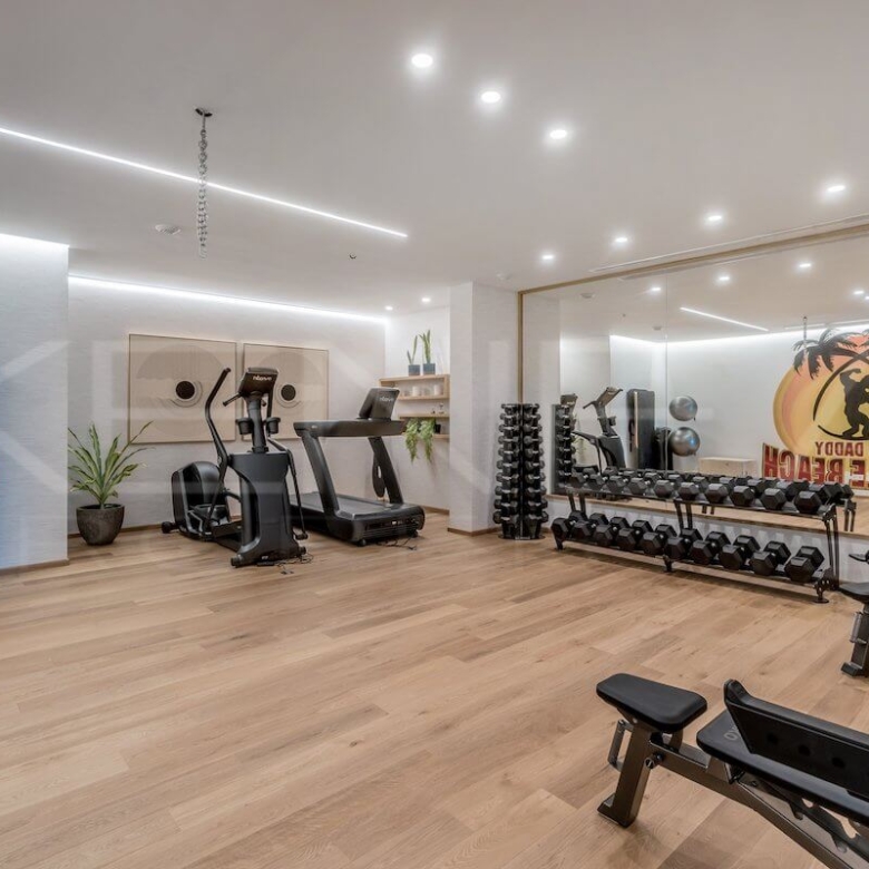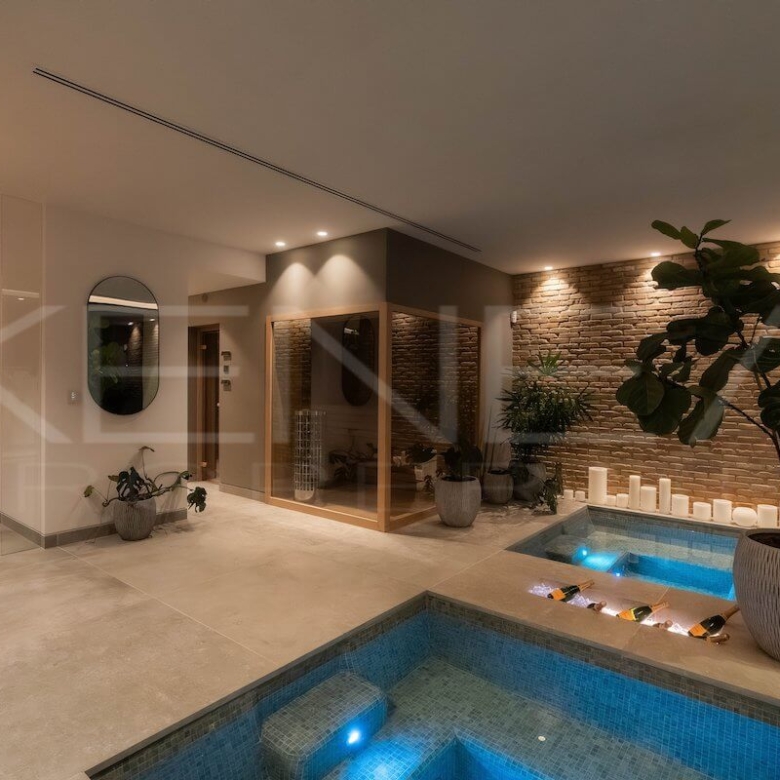 La villa cuenta con una zona de spa privada equipada con piscina interior climatizada, sauna, baño turco y sala de masajes. Además, dispone de un gimnasio profesional Eleiko y una amplia sala de entretenimiento ideal para cine, juegos o reuniones familiares.